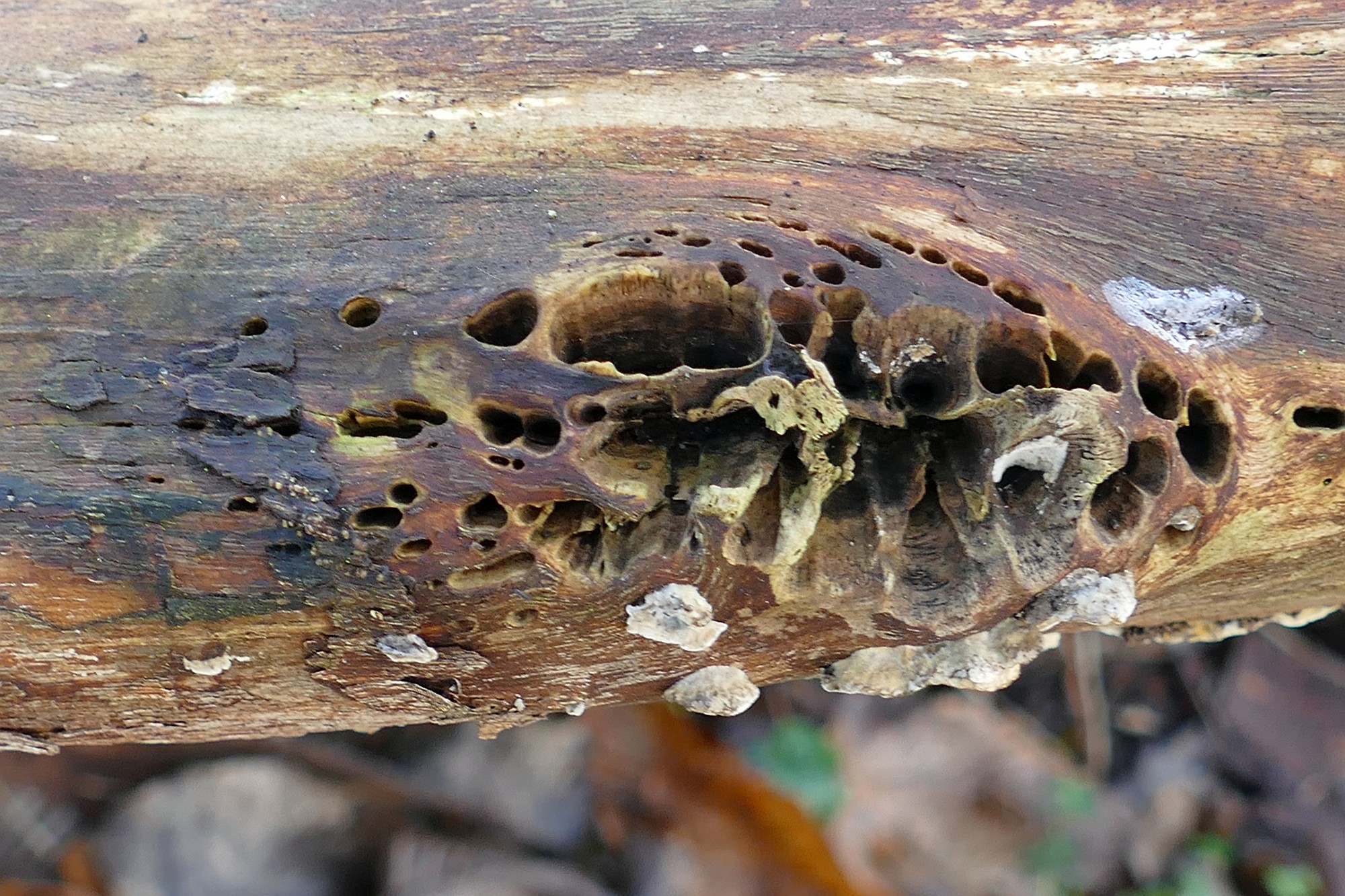 Bei einem kleinen Winterspaziergang fielen mir in einem dicken Totholz-Ast zahlreiche Löcher auf. Wer oder was könnte ihr Urheber sein? Insekten, Vögel, Pilze - oder doch etwas ganz anderes - etwas, das wir hier vor ein paar Jahren schon einmal vorgestellt haben?